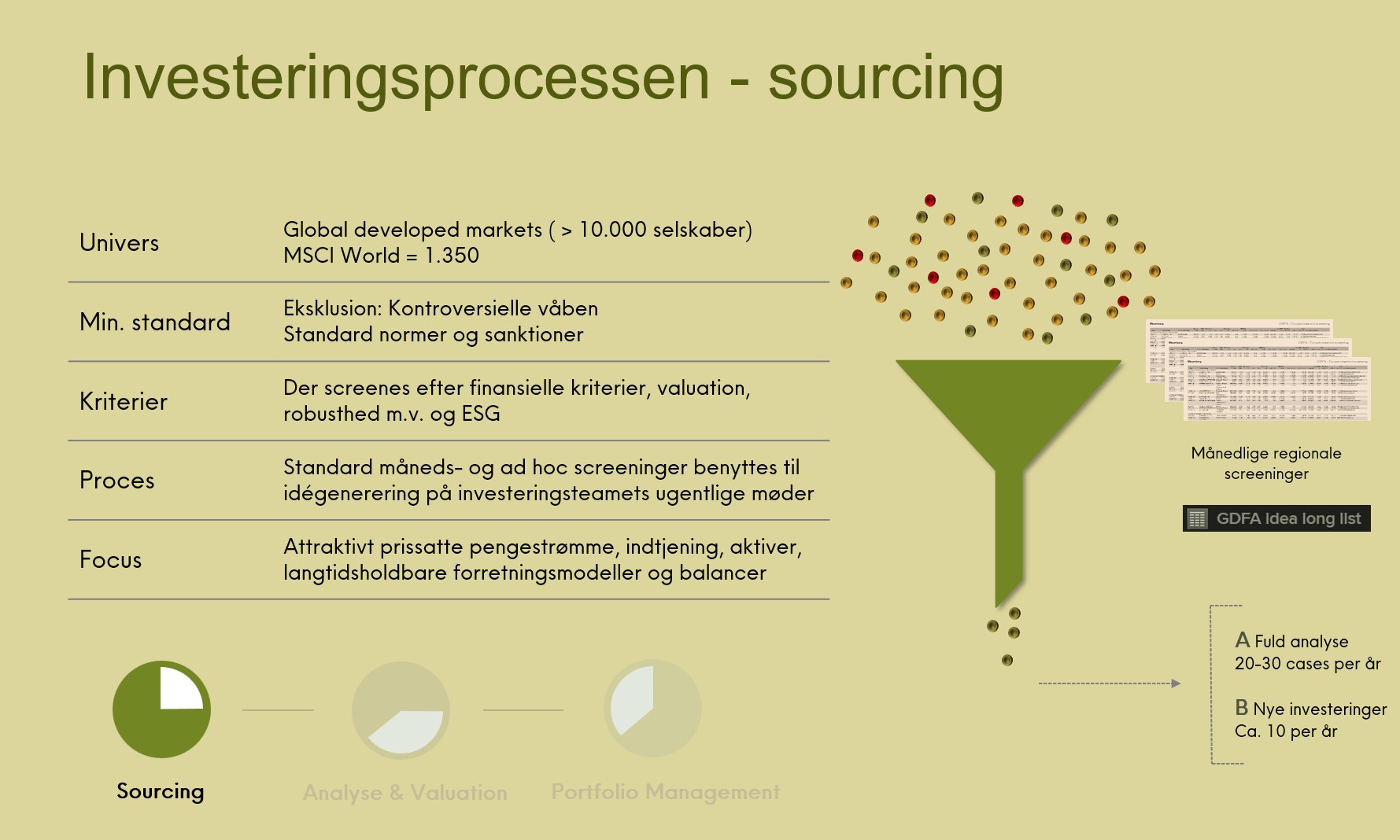 På de globale aktiemarkeder er der tusindvis af muligheder. Vi finder de 30-50 af dem der passer ind i strategien, dvs. fokus på billig indtjening, billige aktiver og billige pengestrømme samt - selvfølgelig - høj finansiel styrke